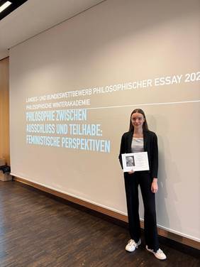 Für Maren Oelrich, die vierte Teilnehmerin, gab es den „großen Buchpreis“ des Landesfachverbandes Philosophie und die Weiterempfehlung an die Winterakademie in Münster. Sie ging beim Schreiben von einer Aussage Robert Spaemanns aus und gab ihrem Essay den Titel: „Freiheit ist Selbstbegrenzung“. Darin kam sie schließlich zu dem Schluss, dass die Ansicht vieler, Freiheit sei das Recht, alles zu dürfen, unzutreffend sei. Vielmehr „ist sie die Kunst, nicht alles zu müssen. […] In einer Zeit, die Fortschritt mit Kontrolle verwechselt, ist diese Einsicht aktueller denn je.“ Maren Oelrichs Essay überzeugte nicht nur die Landesjury, sondern bescherte ihr auch eine Einladung in die sogenannte Winterakademie. Zum ersten Mal konnte das HAG in diesem Jahr jemanden nach Münster zum Bundeswettbewerb entsenden. 26 philosophisch besonders begabte und interessierte Schüler:innen aus dem ganzen Bundesgebiet trafen sich dort vom 24. bis 27. Februar, um sich auszutauschen und in einer weiteren Runde Essays zu bestimmten Fragestellungen zu schreiben. Die Herausforderung hier: Nun mussten die Essays in englischer oder französischer Sprache verfasst werden. Am Ende erreichte Oelrich einen beachtenswerten 6. Platz.